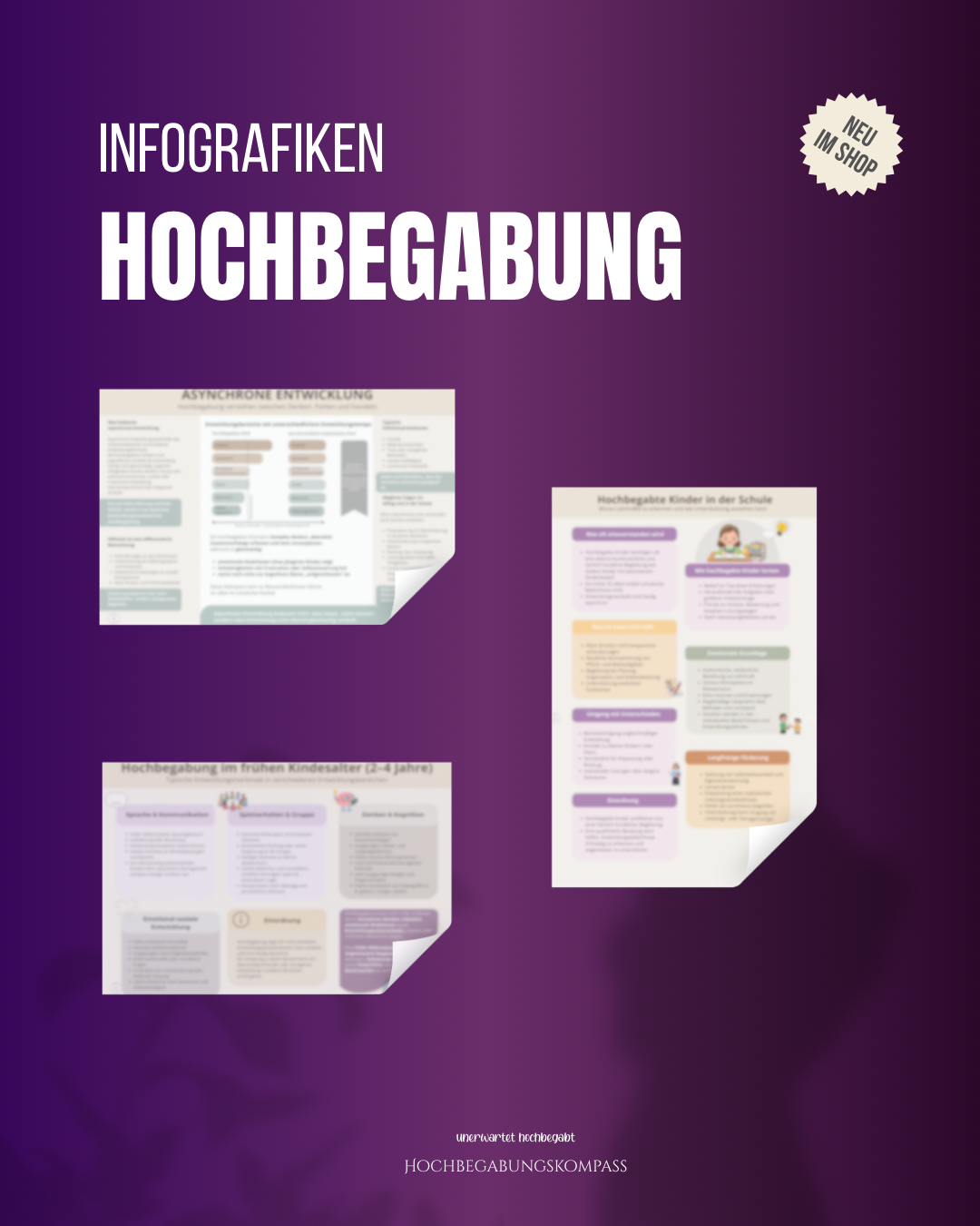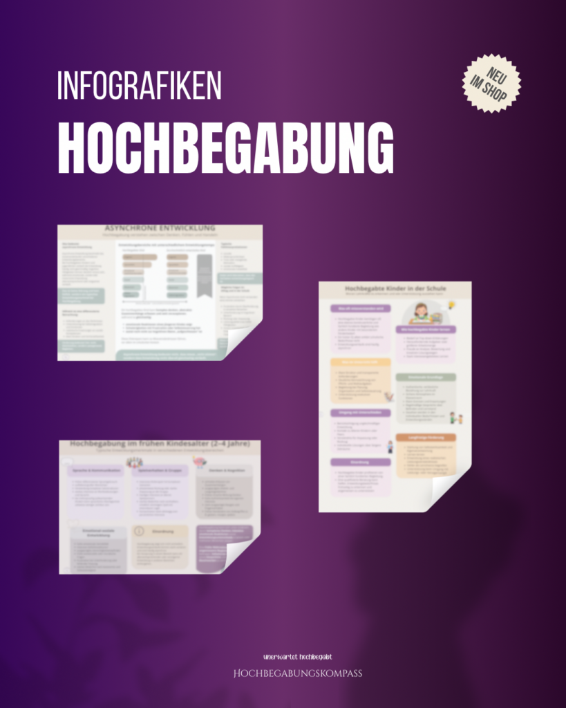 Die Info-Grafiken sind fachlich strukturierte Übersichten zu zentralen Themen der Hochbegabung. Sie dienen der Einordnung von Entwicklungsverläufen, Denkweisen und typischen Fehlinterpretationen und ersetzen keine Diagnostik oder Beratung.